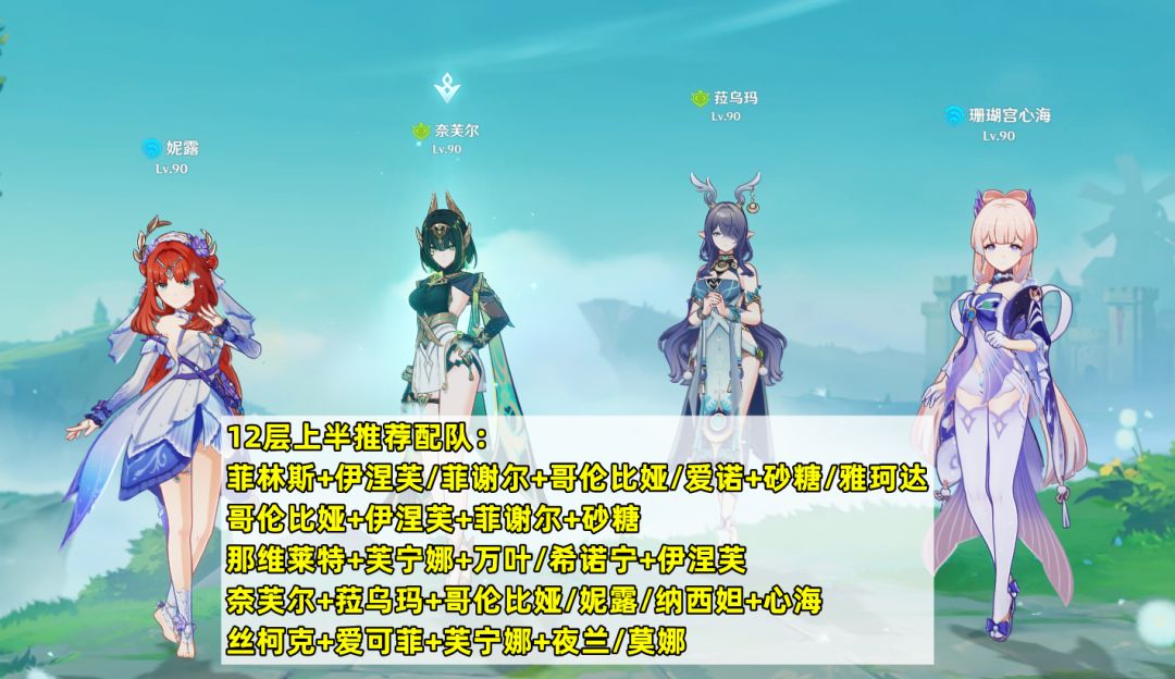 【推荐配队和总结】上半推荐带水元素和月反应角色的配队,比较推荐的队伍有:菲林斯+伊涅芙/菲谢尔+哥伦比娅/爱诺+砂糖/雅珂达、哥伦比娅+伊涅芙+菲谢尔+砂糖、那维莱特+芙宁娜+万叶/希诺宁+伊涅芙、奈芙尔+菈乌玛+哥伦比娅/妮露/纳西妲+心海、丝柯克+爱可菲+芙宁娜+夜兰/莫娜。