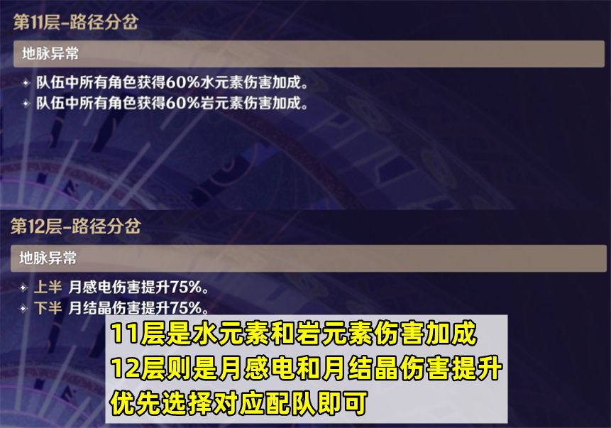 然后是地脉异常buff:11层上下半分别是水元素和岩元素伤害加成;12层则是月感电和月结晶伤害提升。
