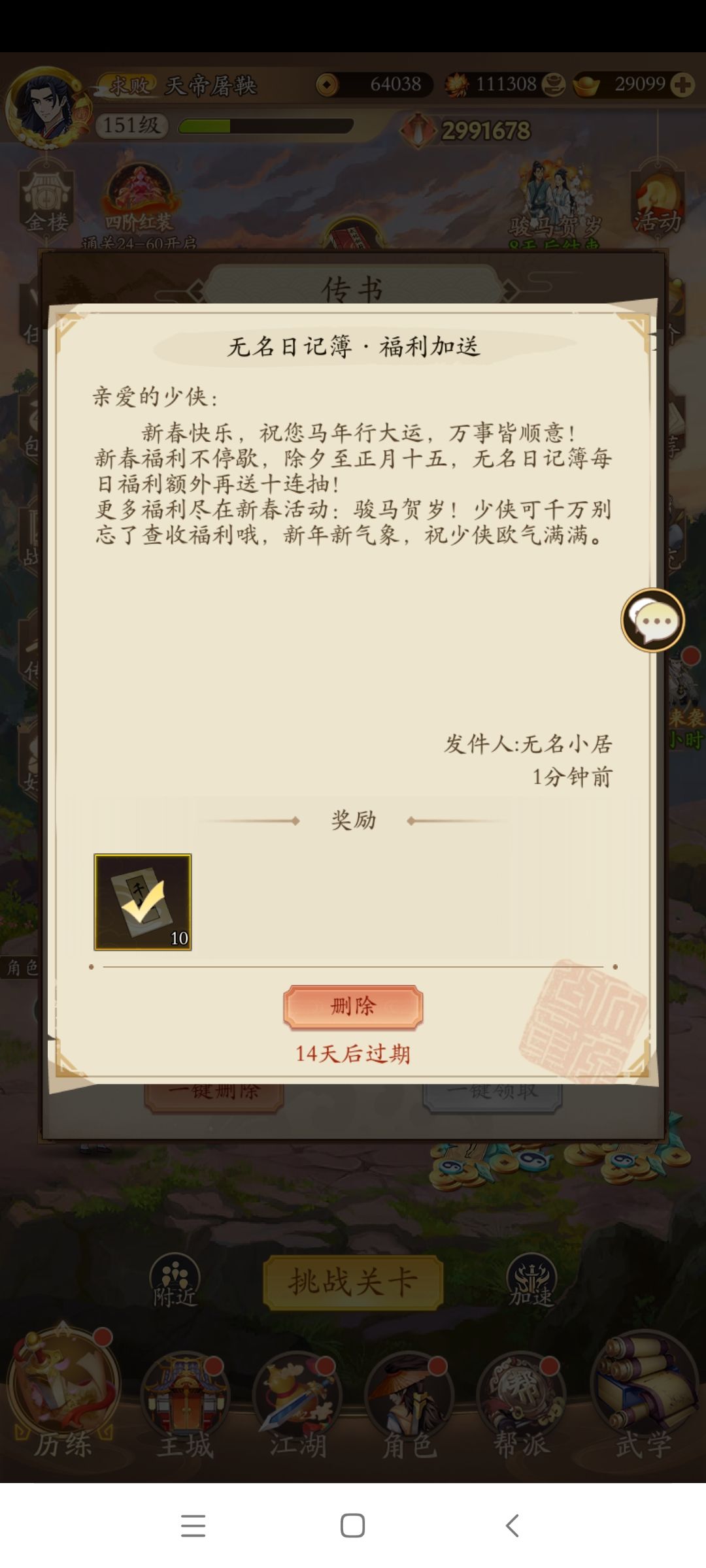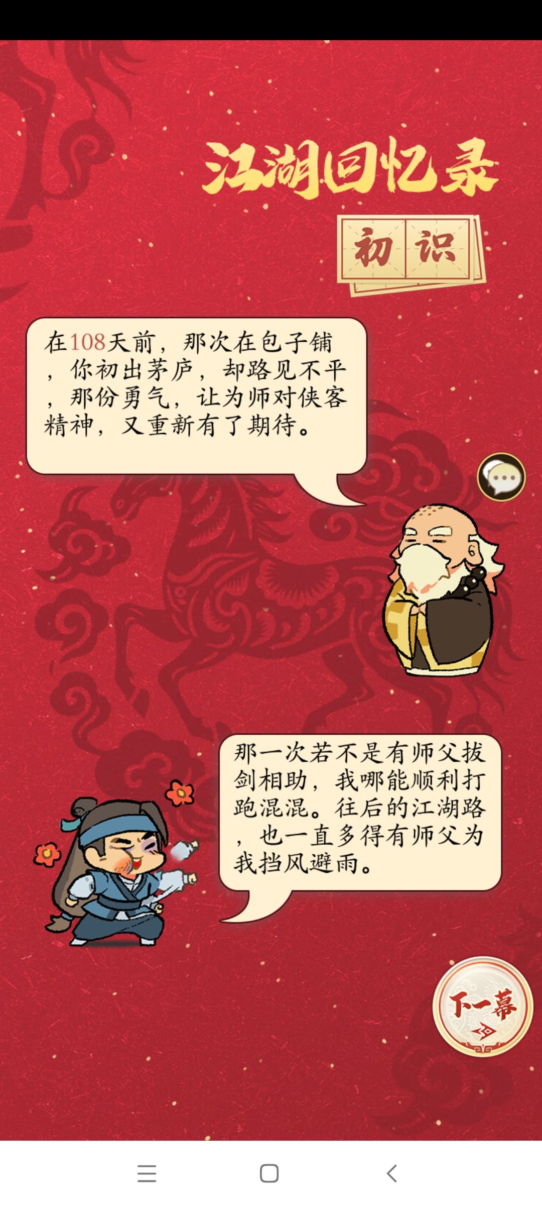 来到江湖108天,我感受颇深,玩的是这个游戏,体会的是整个人生,感恩遇见的每一个人,感谢每个帮助我的人!