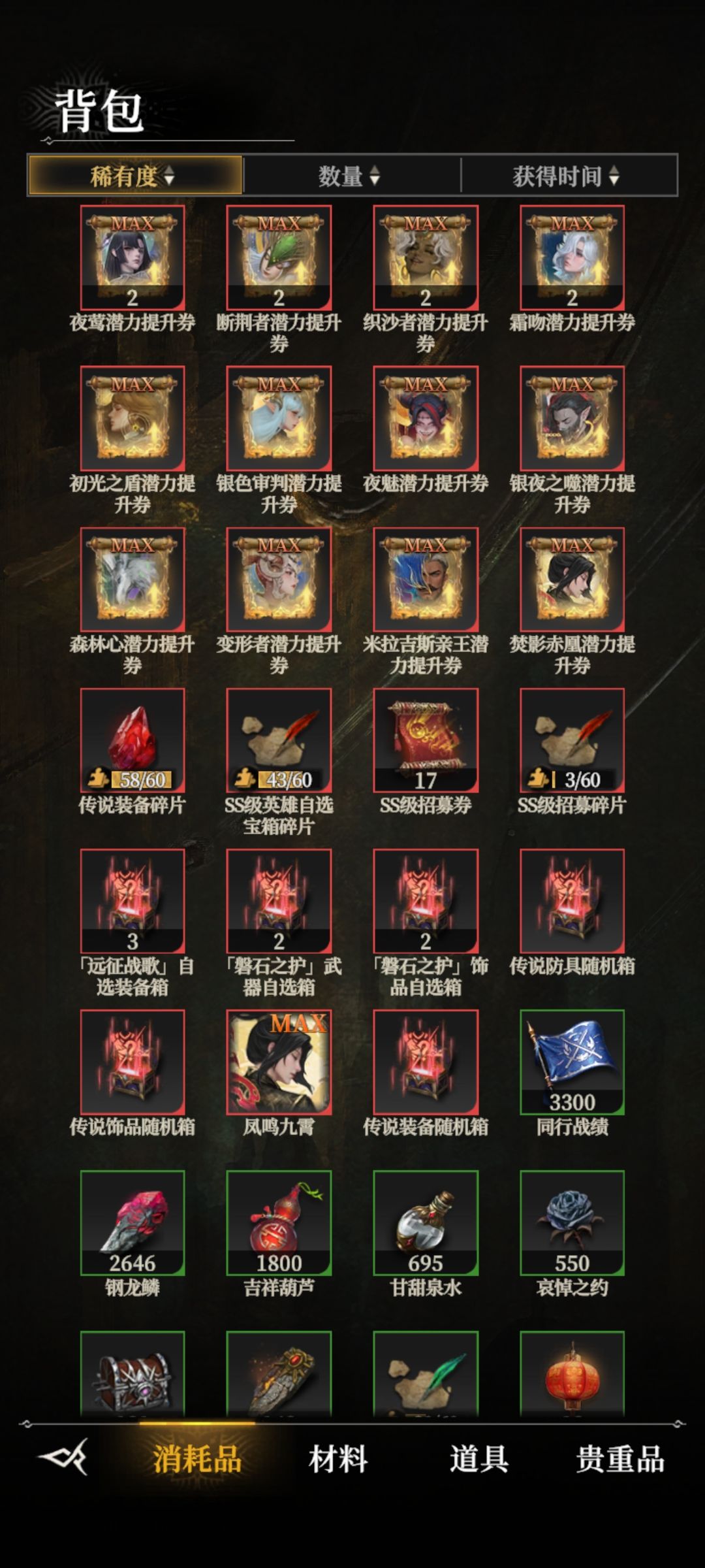 除了阿尔卡因,最低血量了,小骑士和鹿头貌似也不好,列无暇还没招,再过几天招个94潜的看看,估计还得一个多月能到100潜,金币得40-50万之间差不多了,卷已备好,就熬时间了。光盾潜力最低,一直招不到同模板的