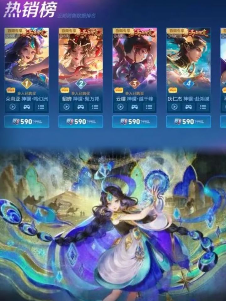 本次六款年限最终销量排名为:朵莉亚-神骥·鸣幻洲、貂蝉-神骥·聚万邦、云缨-神骥·越千峰、狄仁杰-神骥·赴朔漠、马超-神骥·逐星野、关羽-神骥·镇沧海。