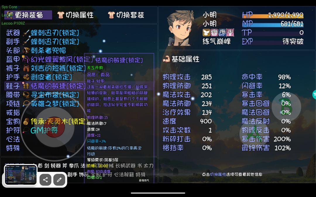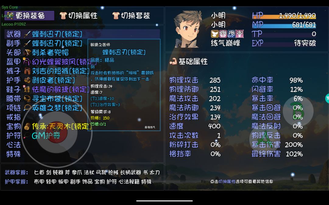 贴下装备和被动,还有现在无门派,接下来就是偷书,打造一个散修小明