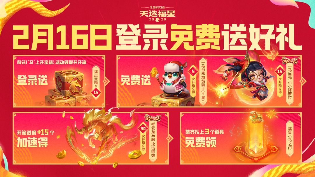 🌟今日登录游戏即可通过【“马”上开宝箱】活动免费领取15个宝箱!全部开启将获得马年限定【一马当先 小小阿萝拉】、【一马当先 小小羽饰骑士】等奖励,还可加速解锁马年限定【祥云龙马踏 攻击特效】。