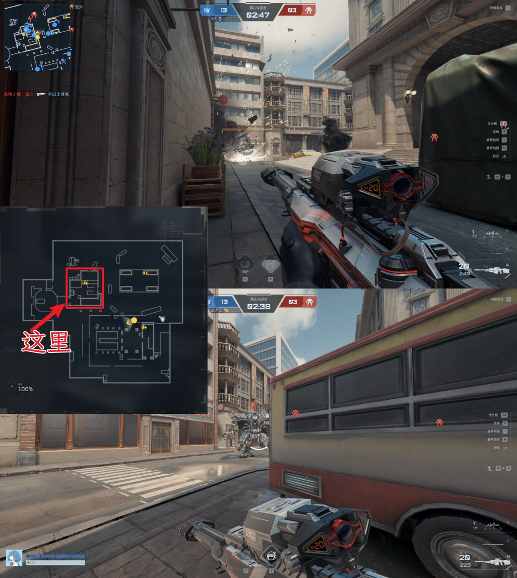 如上图地图右侧的车后,这里可以利用车充当掩体输出,如果太多输出不过来也可以向左边移动进入巷内。