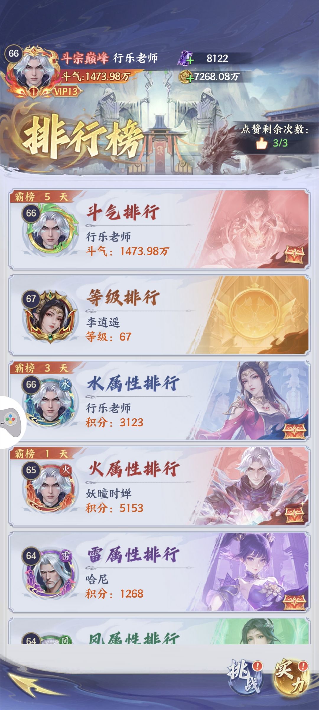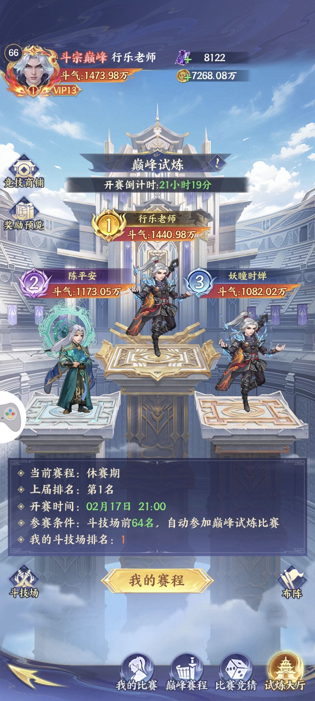 来了来了,今天就是第七天,所以想截图多少都没问题,目前是个摆烂的状态,因为得知第八天出天阶斗技,传说萧炎药老的时候,玩的没啥动力,就想明天狠狠搞一下!今天拿了巅峰冠军,两次公会战都赢了很开心,越战500万跨服打赢了,区里活人还挺多。