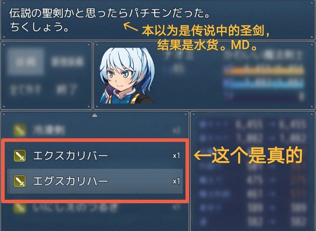 恢复后的埃斯卡里夫剑是娜奥米的装备,名字和赝品相比有微妙的变化,文案也不一样