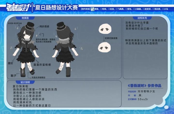 作者:.束. 正式服ID:53vu3r 作品名称:冷冷哥特少女 服装类型:套装 设计灵感:夏日快来 热热的我们需要一个降温的东西 黑色给人一种清冷感 冷脸让人心里凉凉的 用暗色调让人感到冰凉 用雨滴来衬托 以一种创新的方式表达夏日