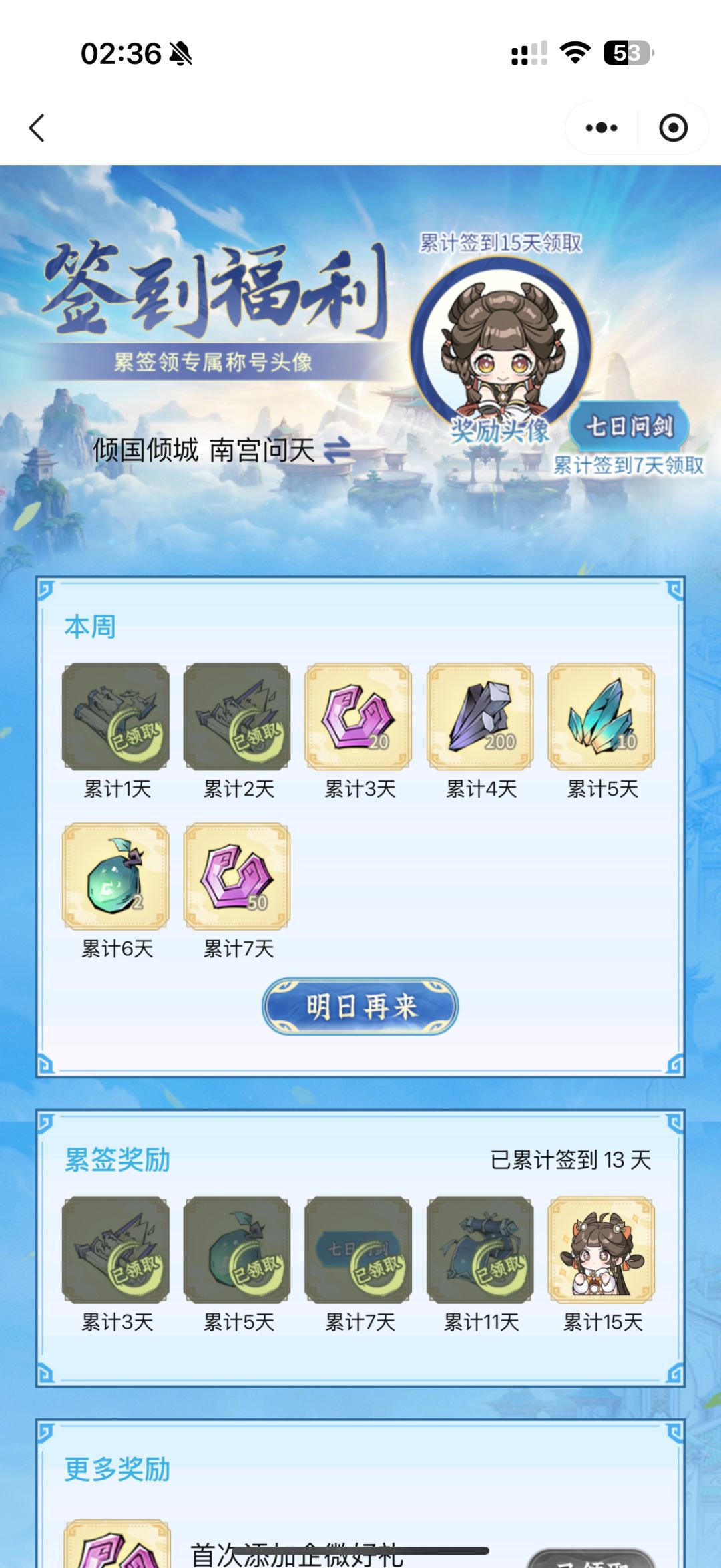 修为来到大乘后期14重87%,境界排名41,战力2076亿,玉元3.67万,签到第13天