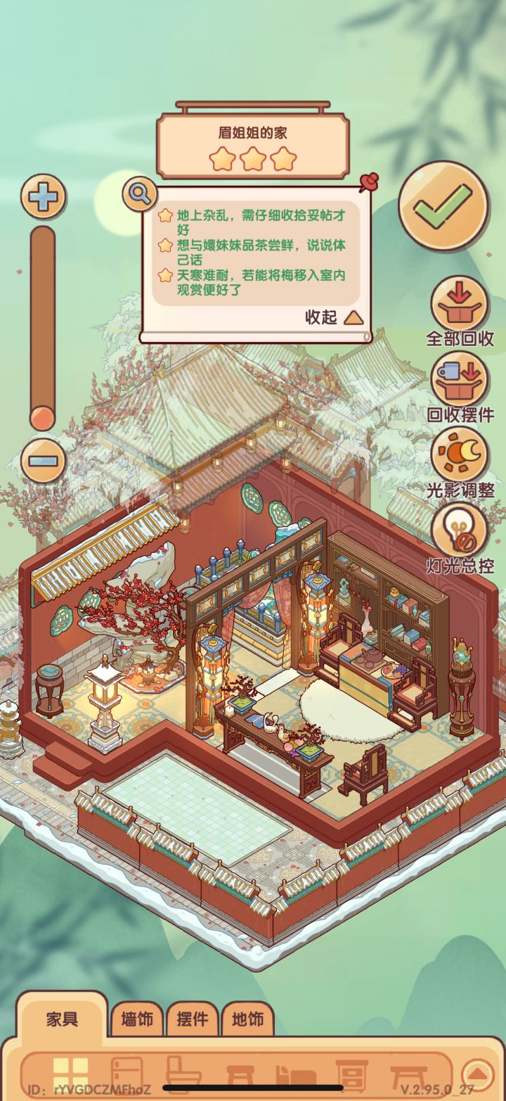 2眉姐姐的家:摆件不能放在地上;谈话的桌上需要放茶具和一盘水果;室外的两盆梅(摆件)需要放到室内(同样不能放在地上)