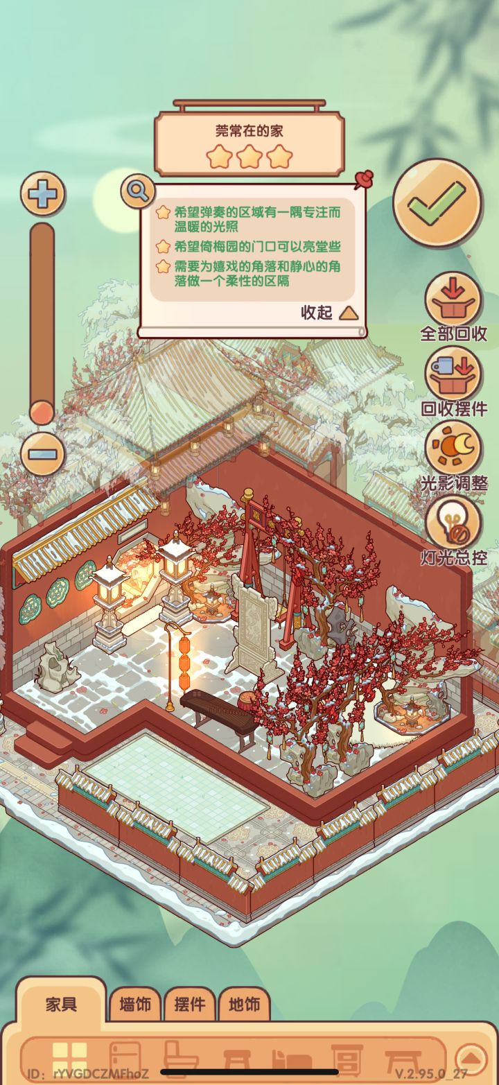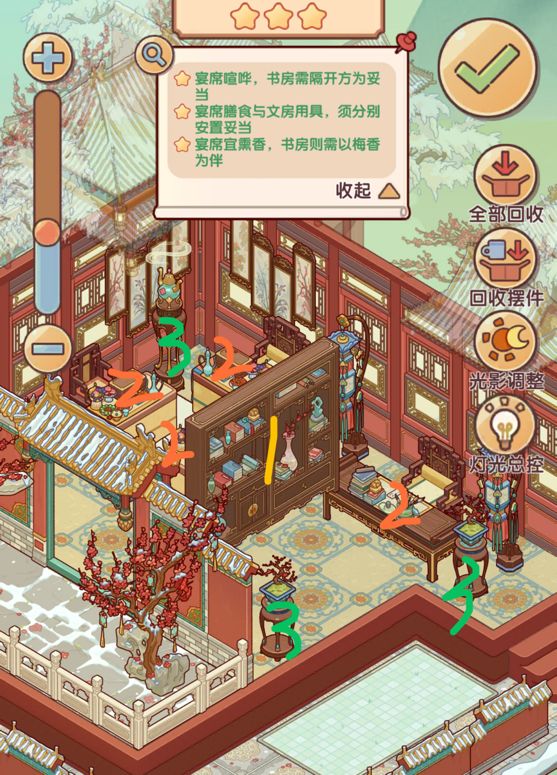 所有任务都无需一键收回家具,在原有的布置上挪动家具即可(不然容易漏放)