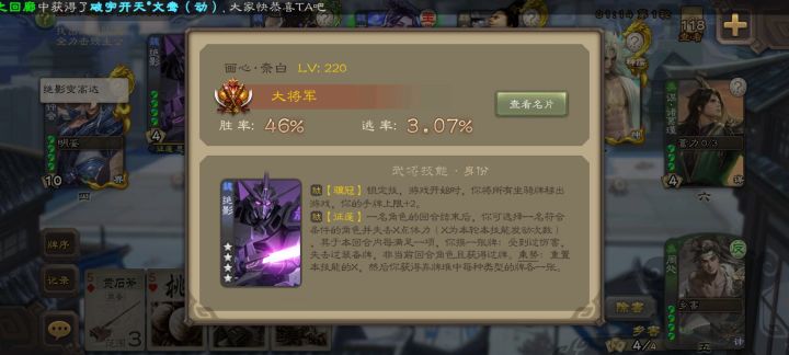 这武将,我今天中午刚开一局就遇到了,科幻是科幻,但是吧,第一次用的人,真滴菜,被终会开局突突死,因为这武将我点了获得看看,是军八体验,应该是还没出