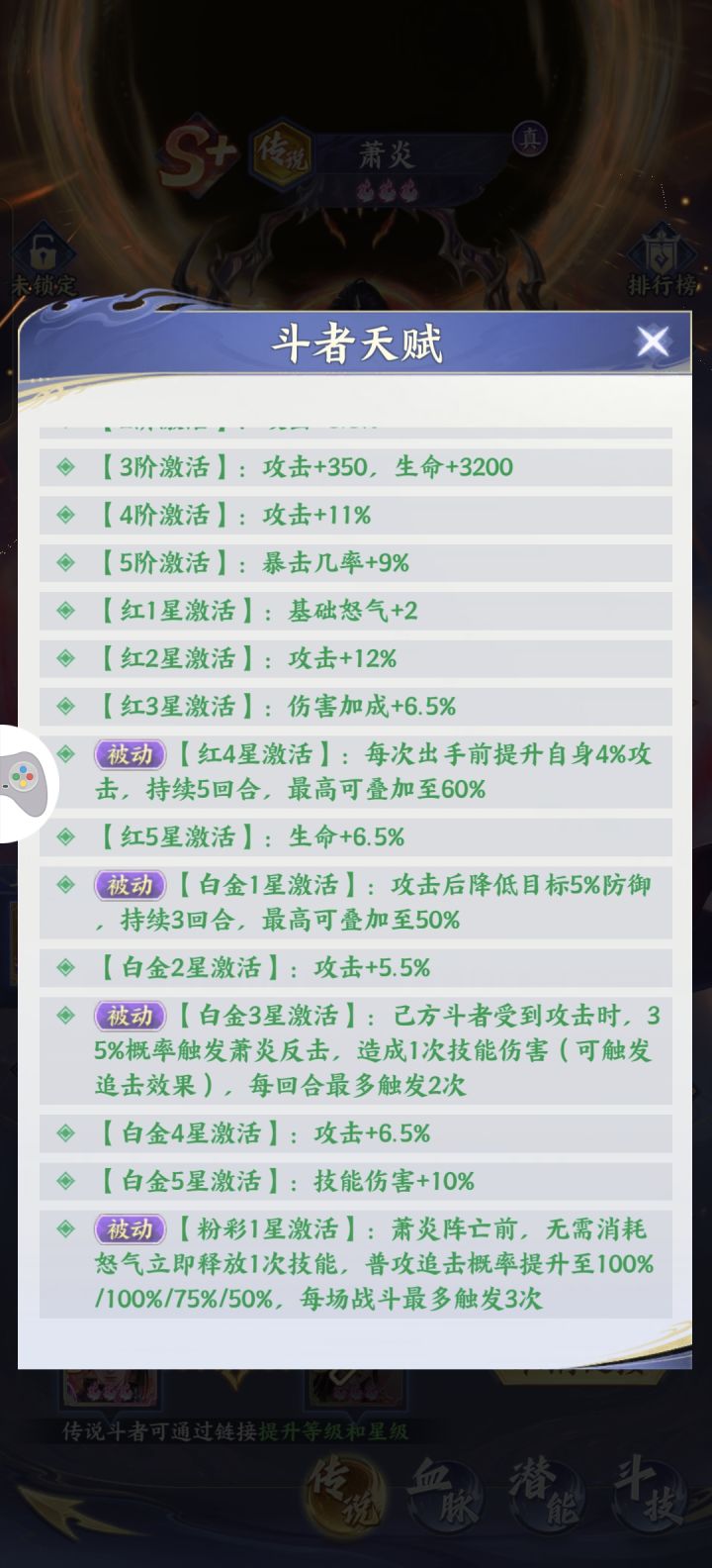 看完他的技能了,现在就看他的天赋,天赋先从他的被动入手,就比如传说萧炎红四星每追击一次就增加多少攻击之类的,这样的被动一条一条的看下去。
