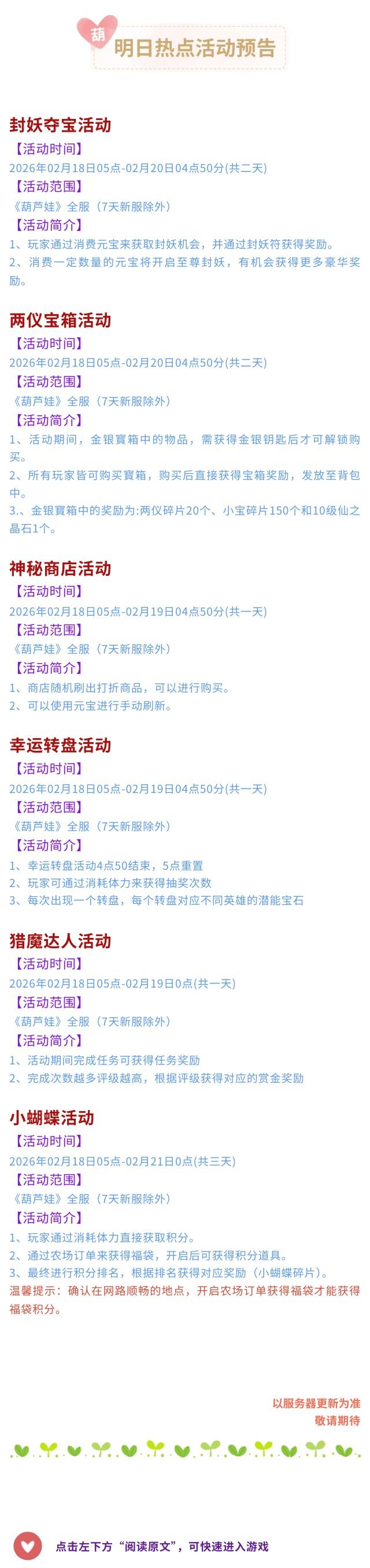 【葫芦娃】2月18日活动预告