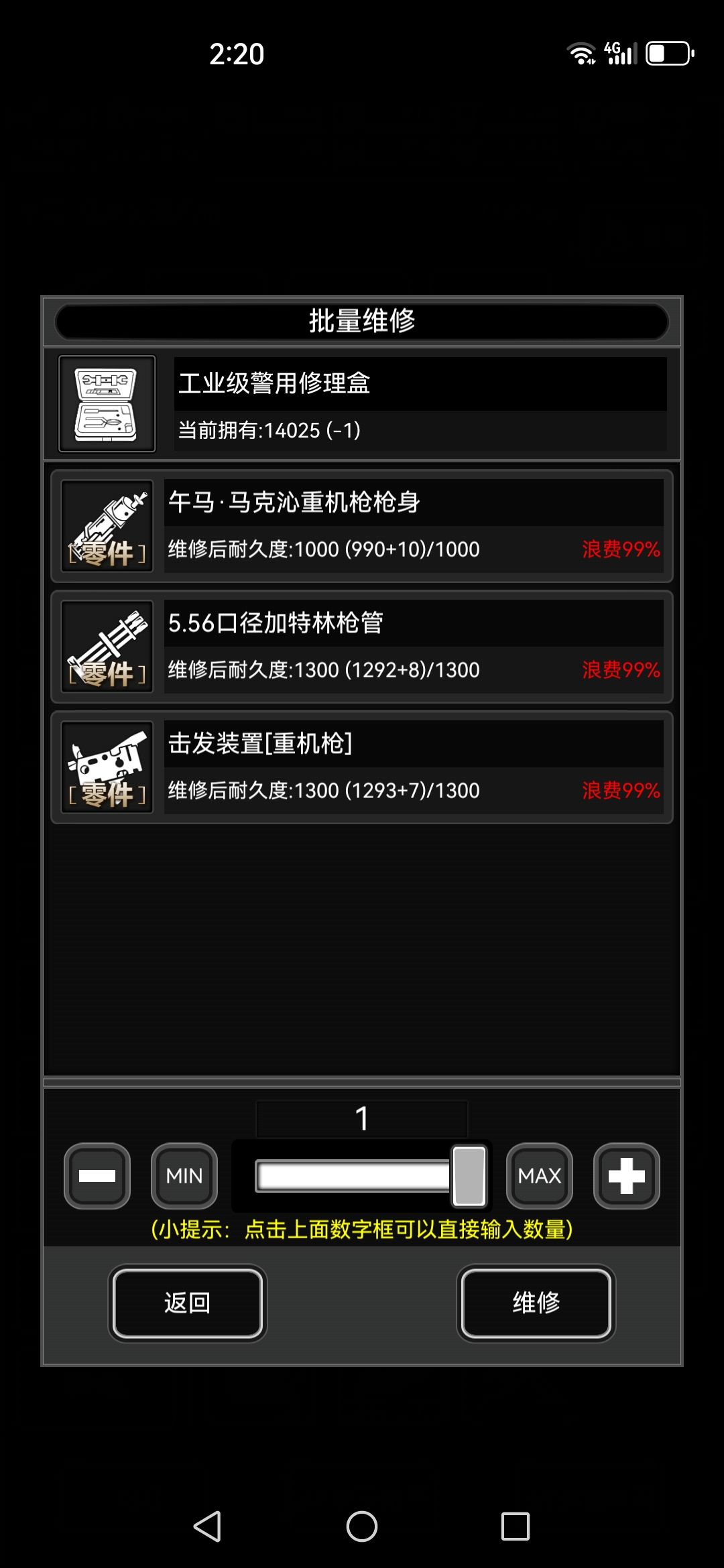 这个机枪不能台修,不过只盒修配件还行。记住用盒子修的时候把限定枪口下了,不然的话,维修会特别贵。