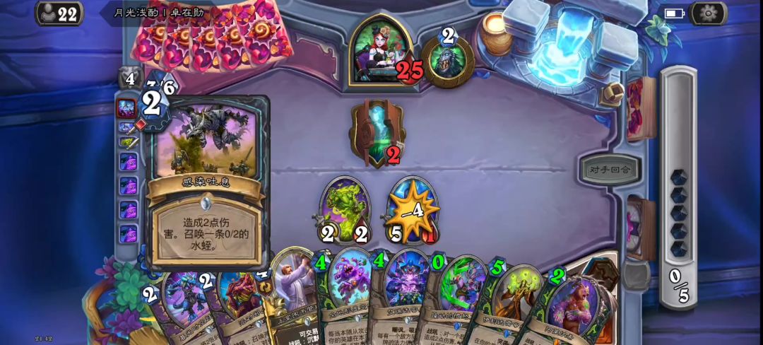 这里按别的卡组应该打沉默,但作为挟持术已经一手减费卡了(大哥居多,左边两个非恶魔的2费,蛮兵减到2费)理应拍怪,但对叠减费的恶魔熊给这么多牌变,可以有很大的期待。