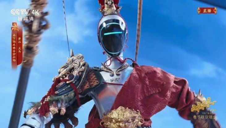 节目中,宇树科技人形机器人身披《黑神话:悟空》标志性彩挂战袍与红袍,在《云宫迅音》的经典旋律中登场。这台 “赛博大圣” 高度还原游戏形象,配合无人机与智能装备表演流畅棍法,实现传统文化与前沿具身智能技术的完美融合。