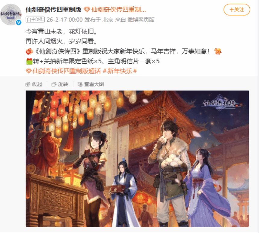 2026丙午马年新春,《仙剑奇侠传四:重制版》官方微博正式发布全新新春贺图,向玩家送上节日祝福。画面以热闹喜庆的古风市井灯会为背景,云天河、韩菱纱、慕容紫英、柳梦璃四位经典主角悉数登场,结伴同游,氛围温馨治愈。