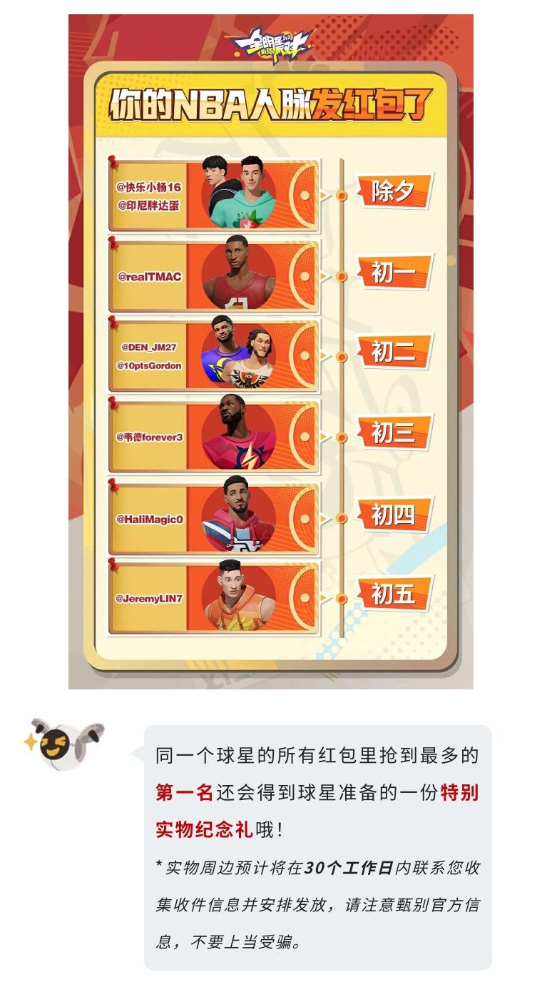 届时,记得上线蹲守NBA球星们发的拜年红包,把巨星的新年好运揣进兜里!