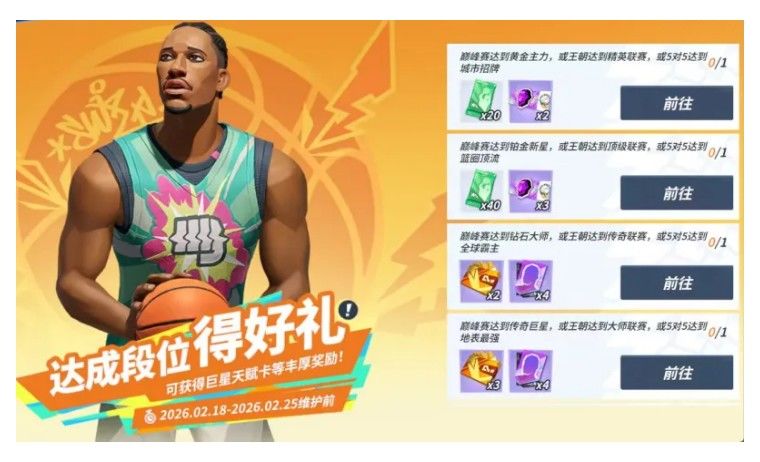打打球,冲冲段位还能拿培养材料?2月18日至2月25日,[段位冲刺福利]活动来袭!在当前赛季期间达到目标段位,即可带走天赋中级材料、巨星天赋卡自选包、明星天赋卡、群星汇集券,全面提升你的球员实力。