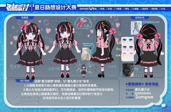 5.色彩对比:黑粉色头发与粉黑相间的服装形成强烈视觉冲击,提升角色辨识度。