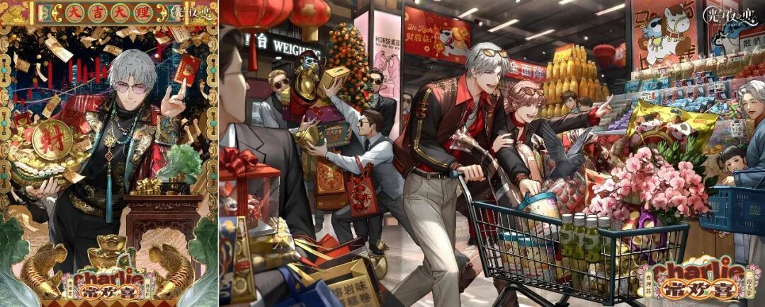 人设上有点「钻石王老五」意味、钱多花不完的查理苏,与“你”在超市采购年货,购物车已经满到不行,两人却指着前方笑开了花,看来还要继续买买买。一旁的婆婆和孙女投来了好奇的目光;远处的情侣/夫妻循着笑声也看了过来;查理苏的管家们则在后方努力维护着年货们的“安全”。