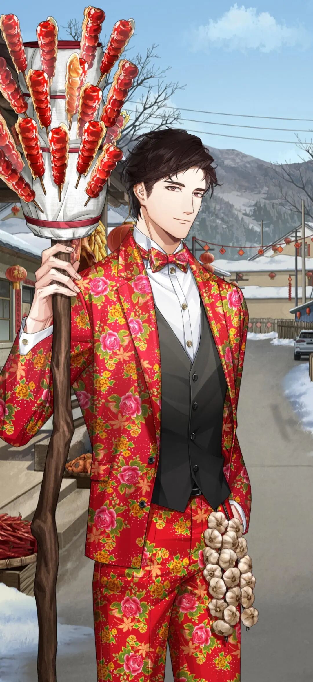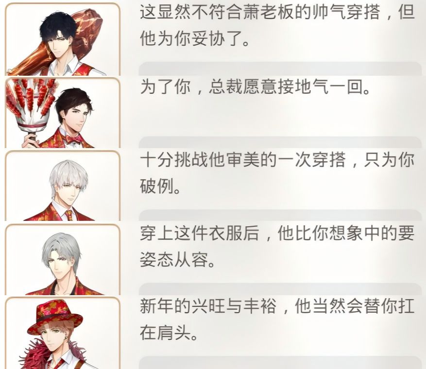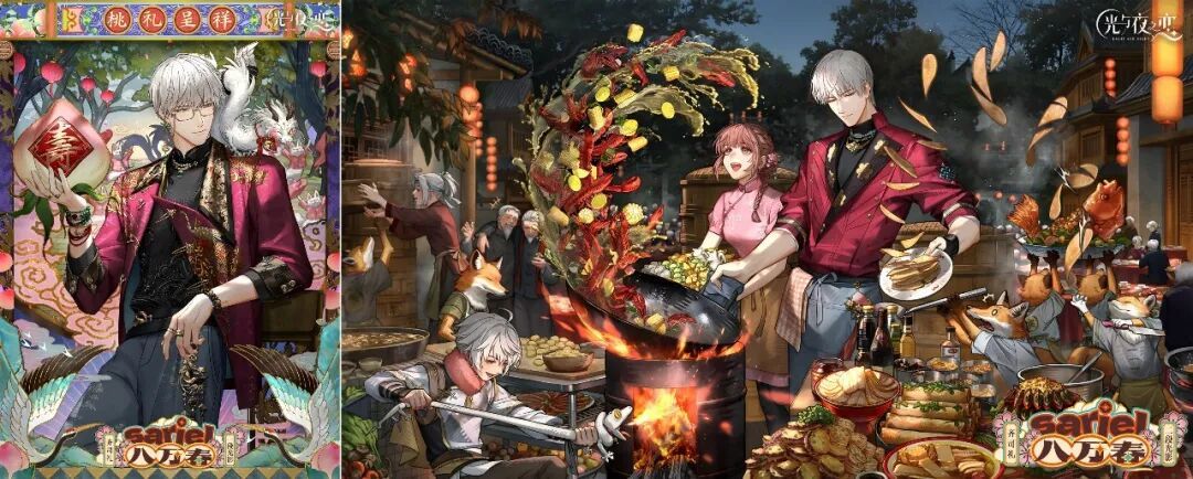 而且,这些群像故事与卡面描述的时刻、活动背景紧密结合,因此与卡面视觉中心的二人世界构成了自然的融合关系:如果用菜来形容,男主与“你”的二人故事,是卡面里的主菜,群像故事则是配菜,共同构成一桌味道和谐的盛宴;如果用音乐来形容,爱情是卡面谱写的主旋律,群像则像副旋律,与前者合奏出年味儿的曲调。