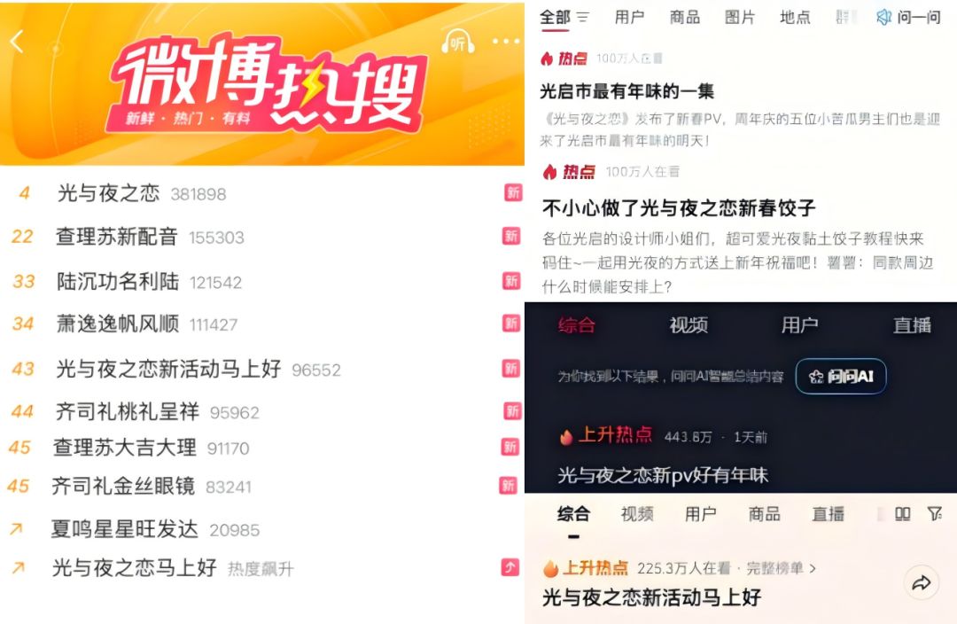 然而,就是这么一个看似挖坑的主题,居然又让《光夜》在全网刷屏:早在一周前新春活动PV释出时,《光夜》就在微博、小红书、抖音等平台冲上了热搜/热点。