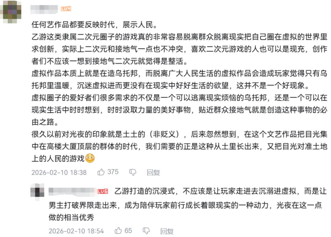多巴胺快感固然能直接让人脸红心跳,但生活中的种种,关于人生价值观的思考……这些内容才更让人流连、回味。用玩家的评论来说,《光夜》不是让人沉溺于虚拟幻想世界,反是让玩家从游戏中汲取面对现实的力量、去发现美好事物。从某种程度上来说,或许《光夜》也在「滋养」、陪伴玩家生活和成长。
