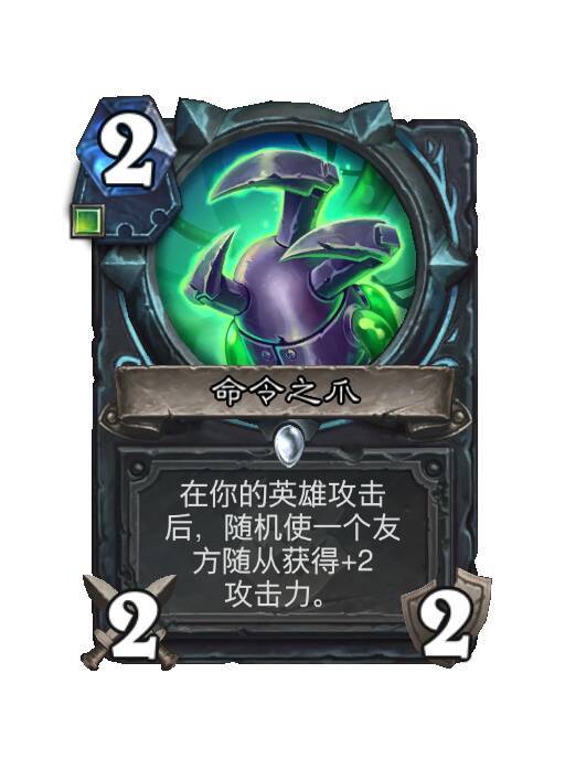 死骑普通武器,2费2/2,邪恶符文,在你的英雄攻击后,随机使一个友方随从获得+2攻击力。