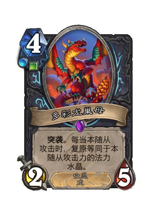 死骑史诗随从,4费2/5,冰霜、邪恶符文,种族亡灵+龙,突袭。每当本随从攻击时,复原等同于本随从攻击力的法力水晶。