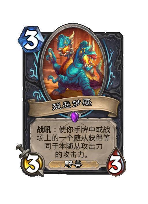 死骑史诗随从,3费3/3,种族野兽,战吼:使你手牌中或战场上的一个随从获得等同于本随从攻击力的攻击力。