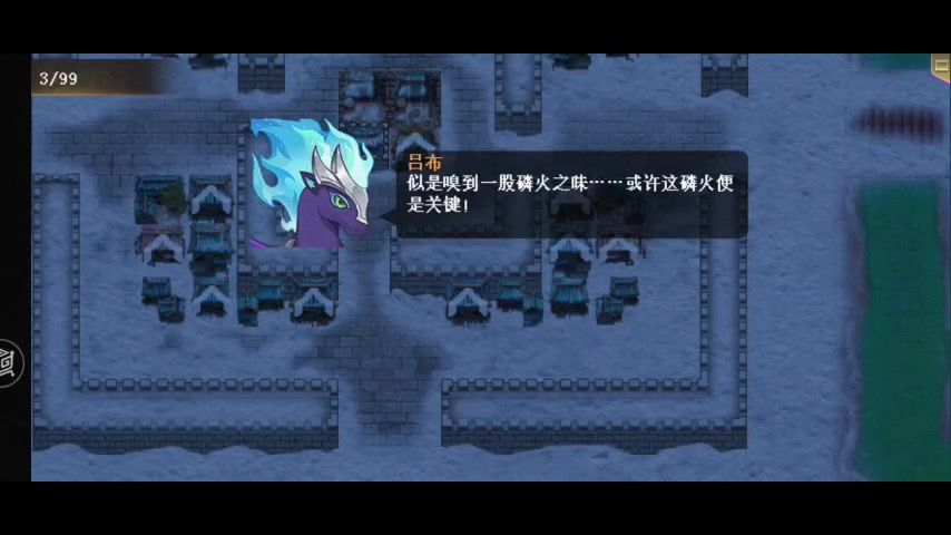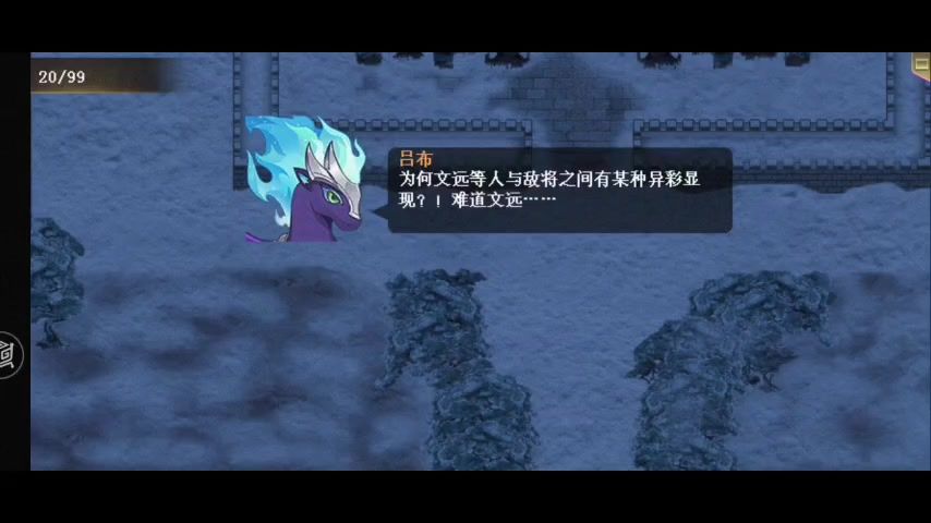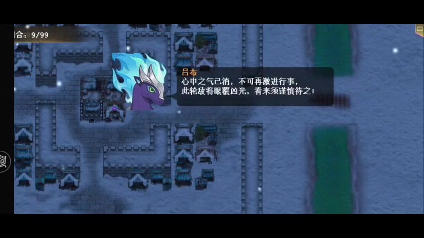 开局只有吕布和臧霸,张辽和高顺被变成敌方武术家,六个武术家中有两个进去城内会变回张辽和高顺,其余四个进去两个游戏失败,保存回合初档等他们进去内城看下哪个是我方的,确定目标后读取存档根据实际控制武术家,吕布杀了武术家会让武术家停止行动两回合,配合臧霸兽面黄金盾和吕布击退拉住他们(最好清理杂兵后占领城池回血,不然血回不上)。第一个我方撤退后会在撤退点出现拦路石,吕布攻击力不够高一回合只能攻击一下石头,张辽、高顺出战后不撤退回合拖久了会失败,后面撤退的配合穿越和盘古过去就行。