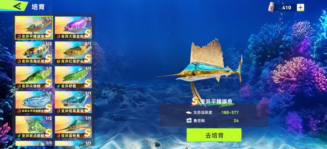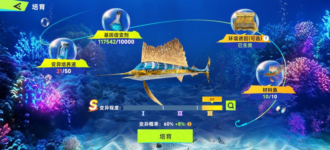 水族馆五级开启变异鱼培养,花费50蓝/紫/橙变异药+10条对应种类材料鱼合成。