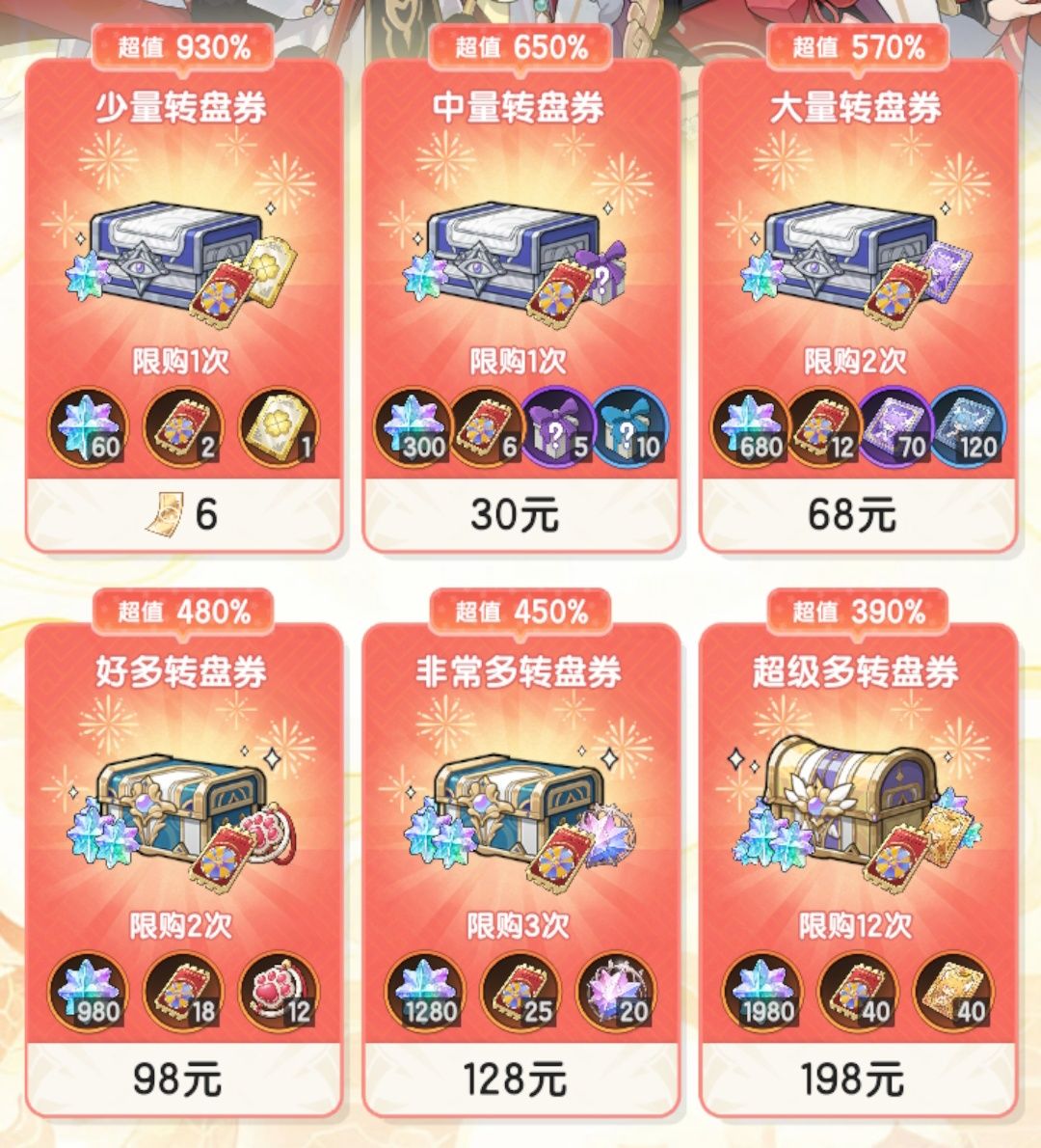 60张保底,首次获得必为自选奖品,转盘券可保留至后续转盘活动,本次活动采取双转盘单池的形式,每个转盘各有1个伙伴+4个古遗物,本次活动若抽取,只推荐抽取【裁红贺新·茗】。
