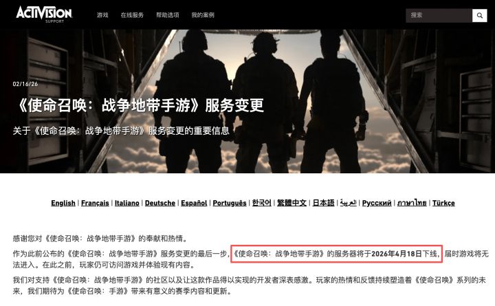 动视表示:尽管我们为成功将《使命召唤:战争地带》以真实的方式带到移动平台感到自豪,它未能达到我们的预期,像在 PC 和主机玩家中那样受到移动玩家的喜爱。