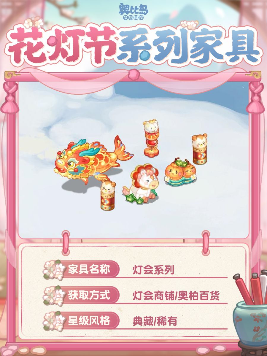 💫2月27日5:00-3月12日23:59期间,【灯会商铺】还上架了「金鳌纳福灯笼」(奥柏百货同步上架)「糖葫芦灯笼」「金橘吉运灯笼」「马到成功灯笼」「游园梦鲤」「影印如意」等诸多家具哦~好物多多,小奥比千万不要错过!