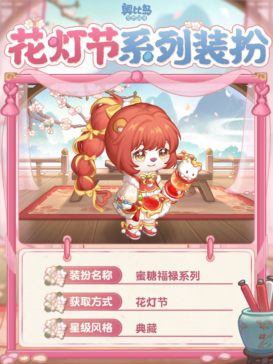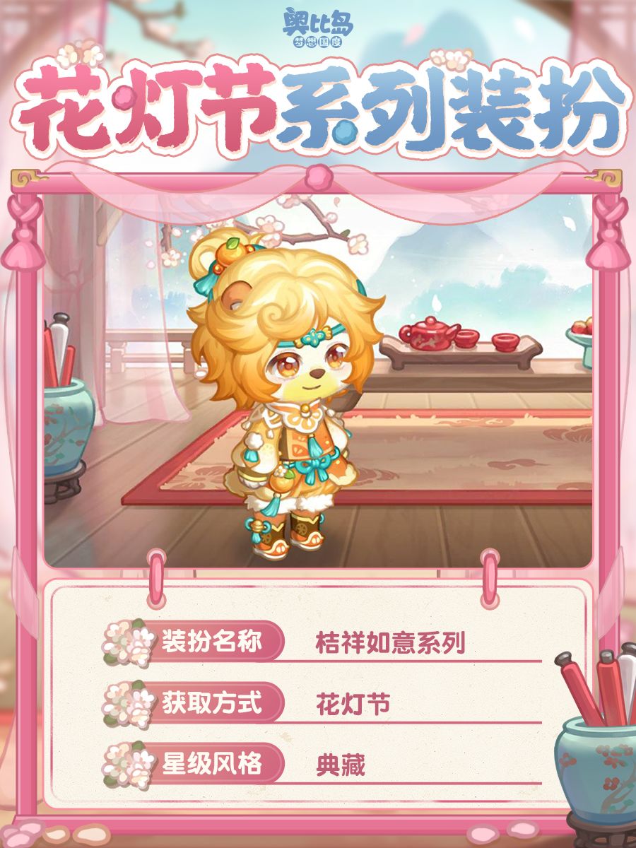 参与「花灯节」活动可获得活动限定奖励,奖励包括服装「蜜糖福禄系列」「桔祥如意系列」「结饺福缘头巾」「结饺福缘蓬蓬裙」「岁岁团圆绵软帽」「岁岁团圆毛绒衣」,家具「糖葫芦系列」,还有全新的头像框「糖心桔意」,背景卡「宁静雅阁背景卡」,背景装扮「满载祝福的滚灯」,动作装扮「金饺送福撒金币」,双人动作「酸甜滋味」,双人坐垫「一碗团圆饺」及晨星品质称号「熊间至味是团圆」等惊喜礼物!此外,在本次活动中集齐全部奖励的小奥比,还可获得限定装扮「空间开场(鱼灯)」。