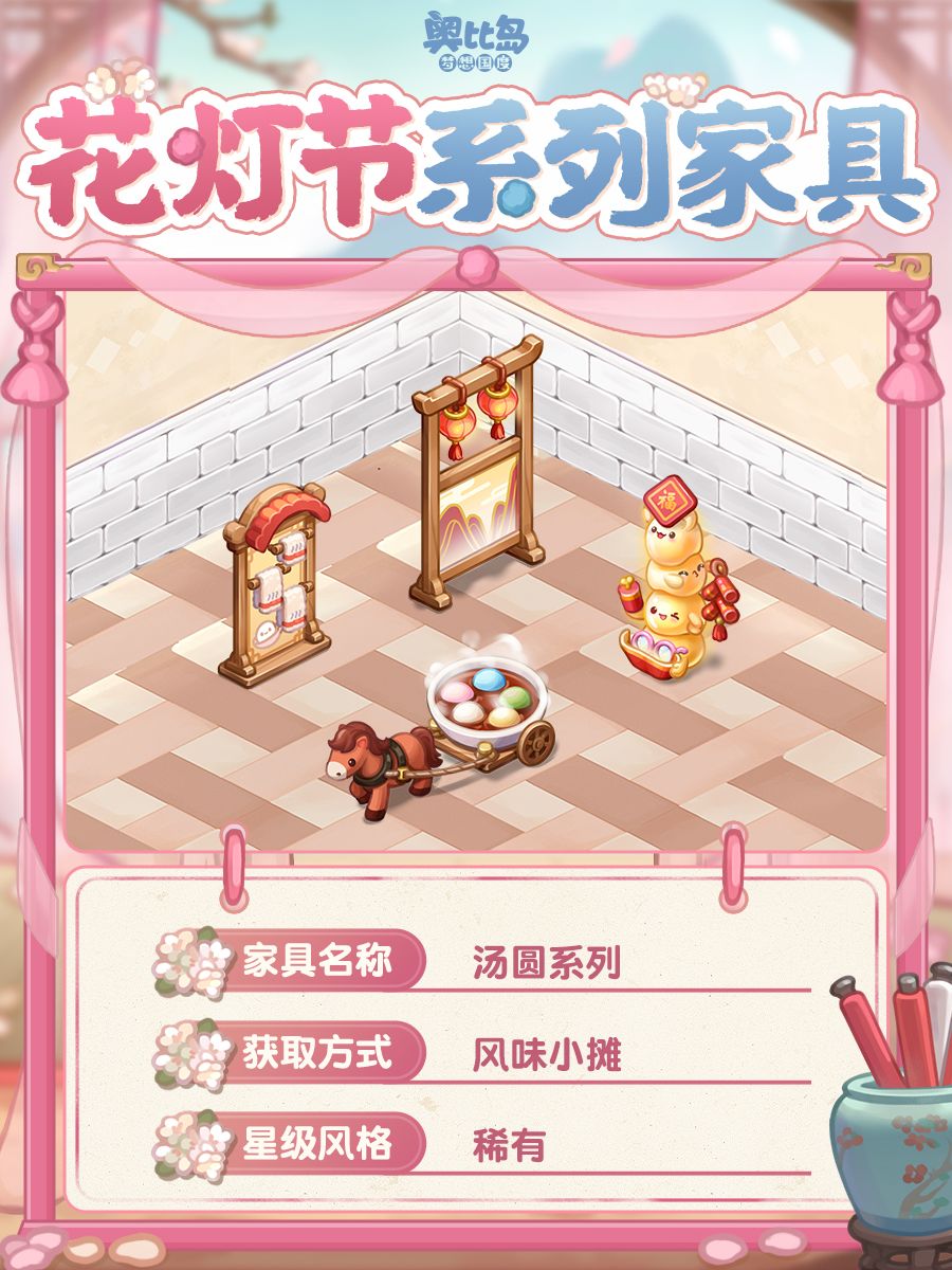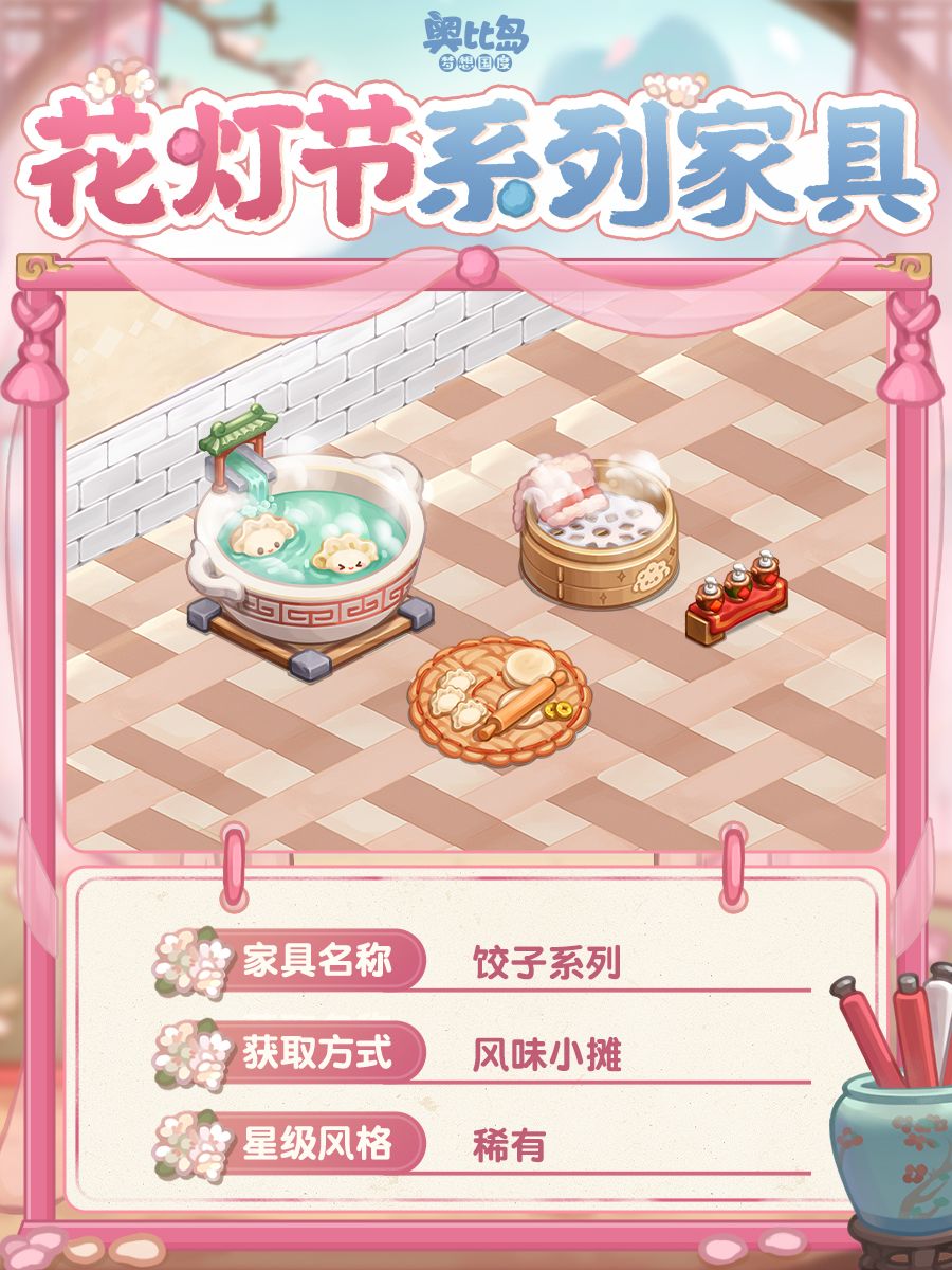 小奥比们参与「花灯节」限时活动,可获得道具「桃花花灯」。「桃花花灯」可在「风味小摊」免费兑换「蜜橘针织衫」「砂糖桔桔皮帽」「好柿花生玩偶」「糖葫芦发箍」等装扮,以及「饺子热腾腾温泉」「饺子蒸笼桑拿」「汤圆小马车」「汤圆毛巾架」等家具,小奥比们不要错过哦~