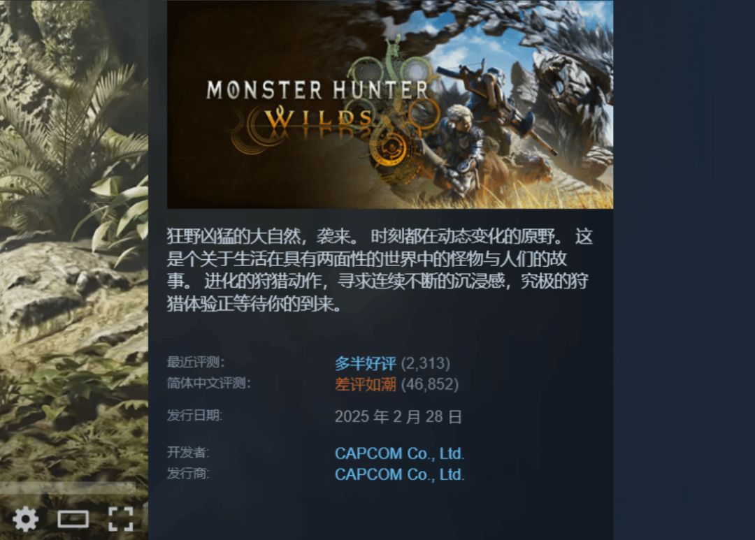 口碑回暖!《怪物猎人:荒野》Steam近30天首次出现多半好评