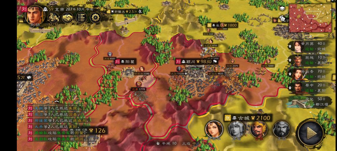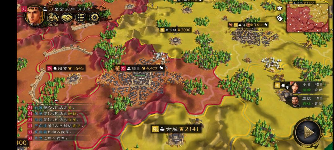 一段时间的调兵遣将后,一共出动了3万左右的兵军队兵临〔颍川〕境外与乱军在此地战争预计消耗1到1.5万左右军队,原本想着这可能是这段时间内的最后一次大进攻了,但是不知为何,乱军率大军集结于〔许昌〕此次主将关羽听闻探马探明〔颖川〕兵力只有1万左右后,便与三位将军互相思考后,便得出了这是一个千载难逢的时机,若寻常的进攻方式,我军损失1到1.5万左右,但这次进攻的话,损失可能1万不到,想到这里便不再犹豫,便率大军悍然袭击。