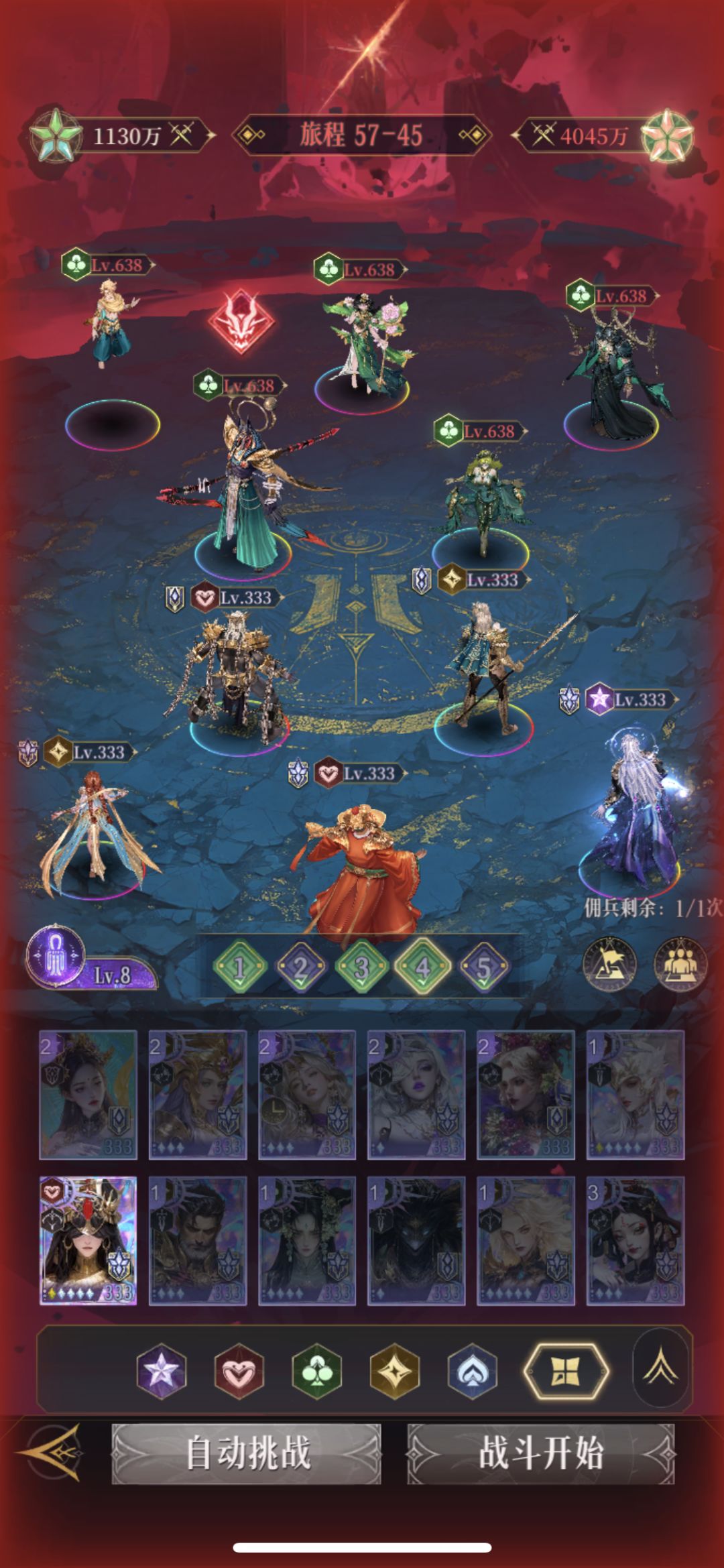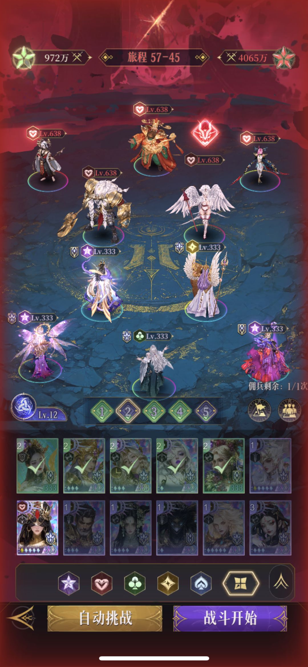 大力神(孟婆,凤凰,财神,射手)我等级比较低,这队得配好一点,不然差伤害,遇到弱一点的队,财神可以换猫或者塞特。一般打梅花或者黑桃