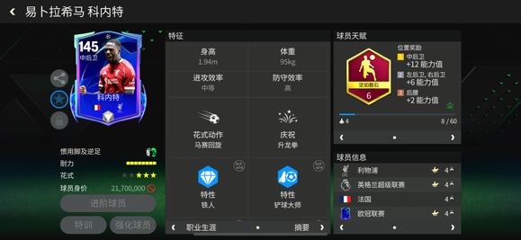 科内特现年26岁,如今他是法国国家队和利物浦的双料核心中后卫。相比于乌帕梅卡诺,他的身材更加高大,阵地防守表现更为可靠。