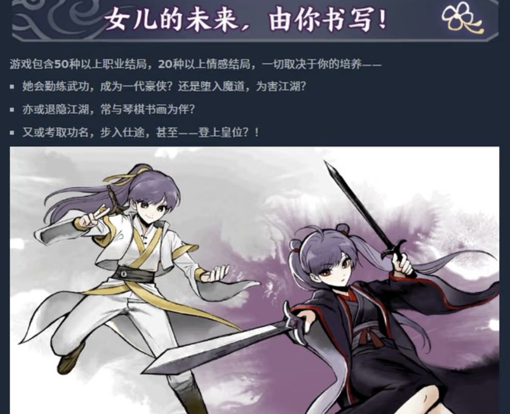 游戏内置50种以上职业结局、20种以上情感结局,女儿可成长为一代豪侠、名门贵女、朝廷命官,甚至登基称帝,命运完全由玩家的培养选择决定。