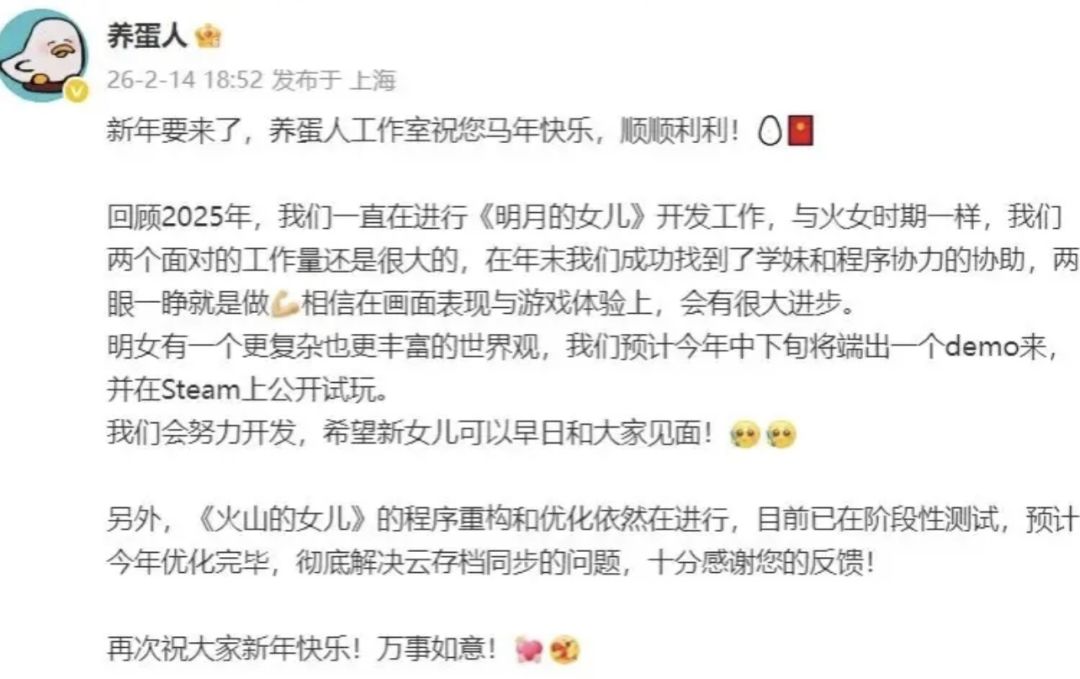 除了新作进度,工作室同步公布《火山的女儿》优化进展,目前程序重构优化进入阶段性测试,预计2026年彻底解决云存档同步问题,同时《火山的女儿:再度重逢》开启TapTap春节限时优惠,兼顾新老玩家需求。