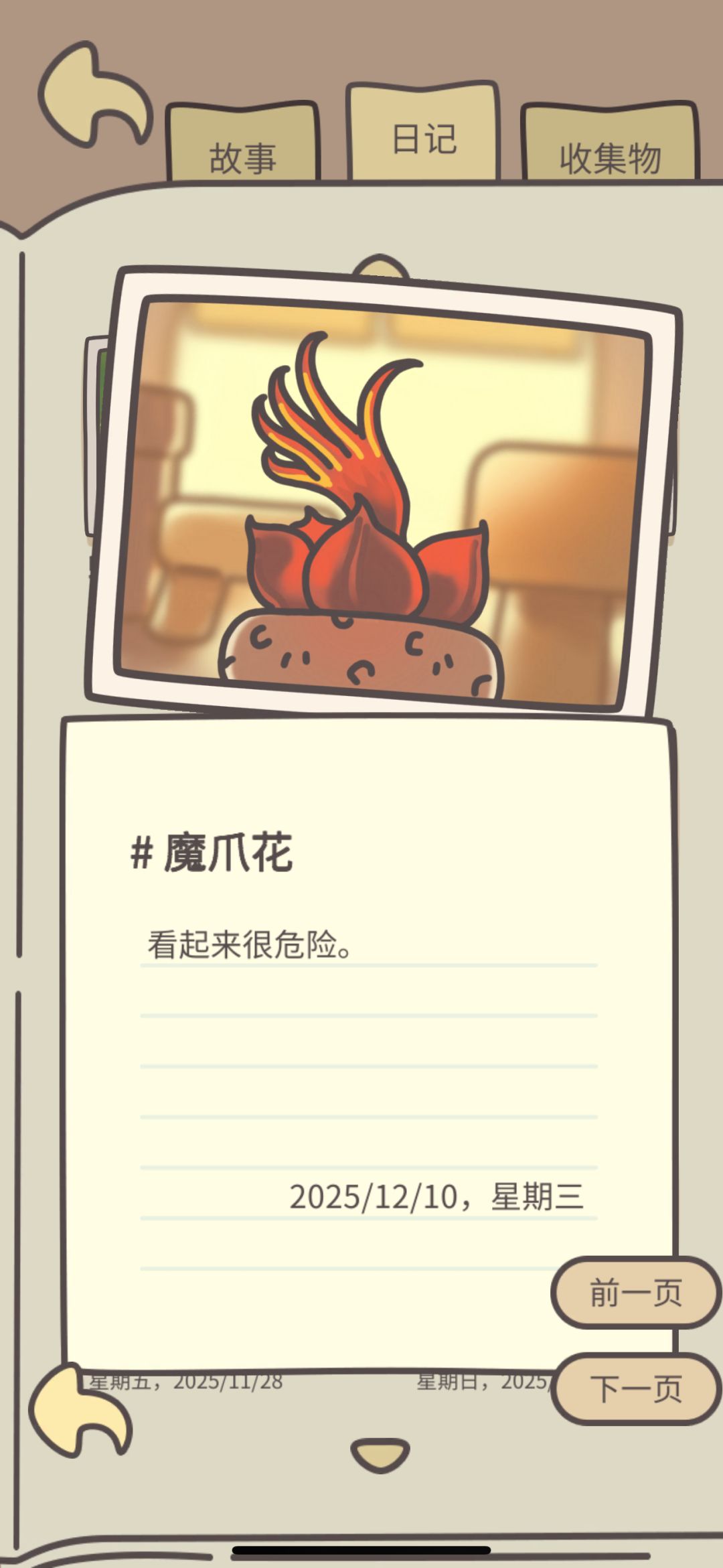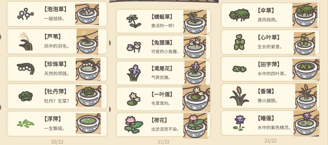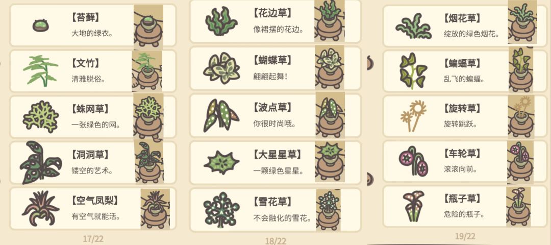 105种植物全图鉴,包含7个花盆(最后一个是水缸)。8个日记(老年人记忆就能想到8个