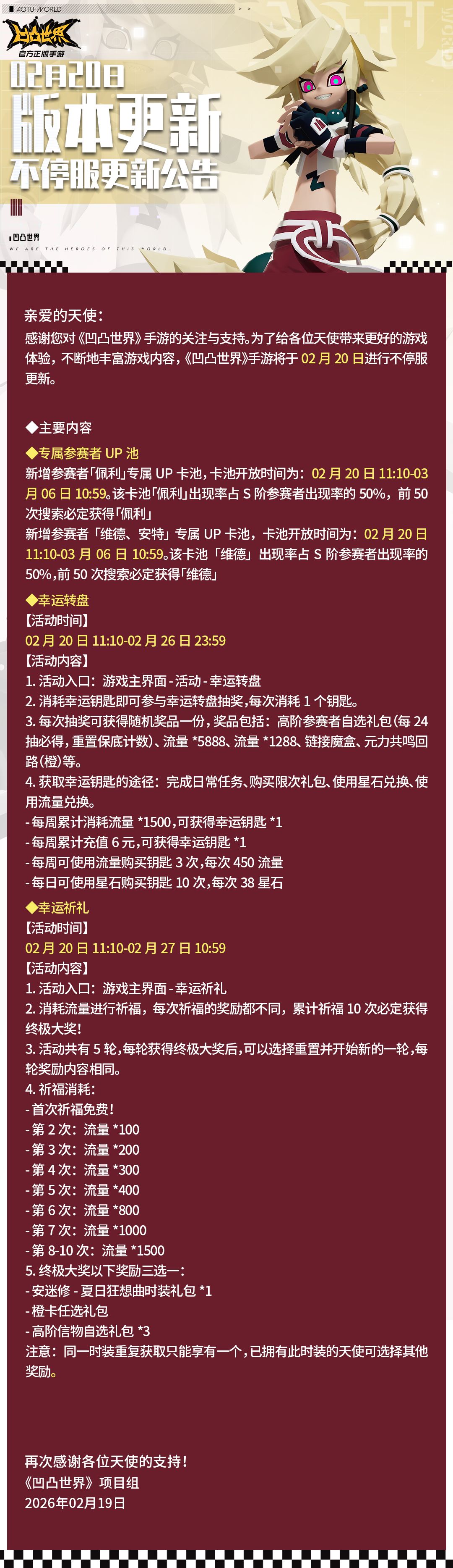 《凹凸世界》手游将于2月20日进行版本不停服更新。