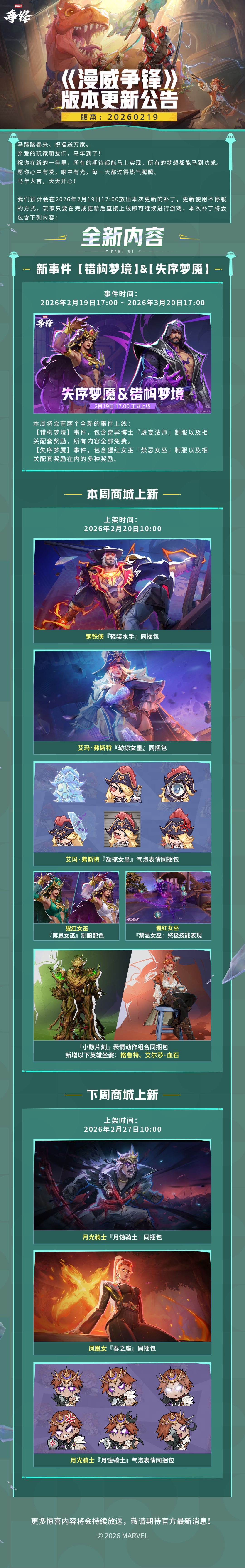 我们预计会在2026年2月19日17:00放出本次更新的补丁,更新使用不停服的方式,玩家们只要在完成更新后直接上线即可继续进行游戏,本次补丁将会包含下列内容: