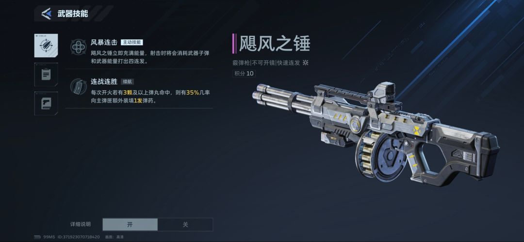 1、主动技能可切换子弹为4连发,能在短时间内打出高额瞬时爆发。