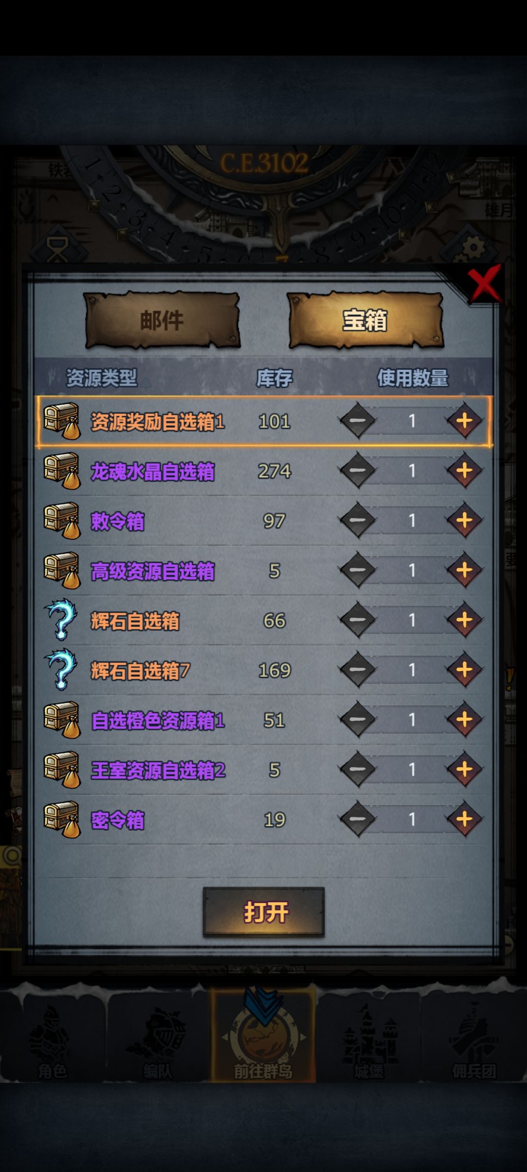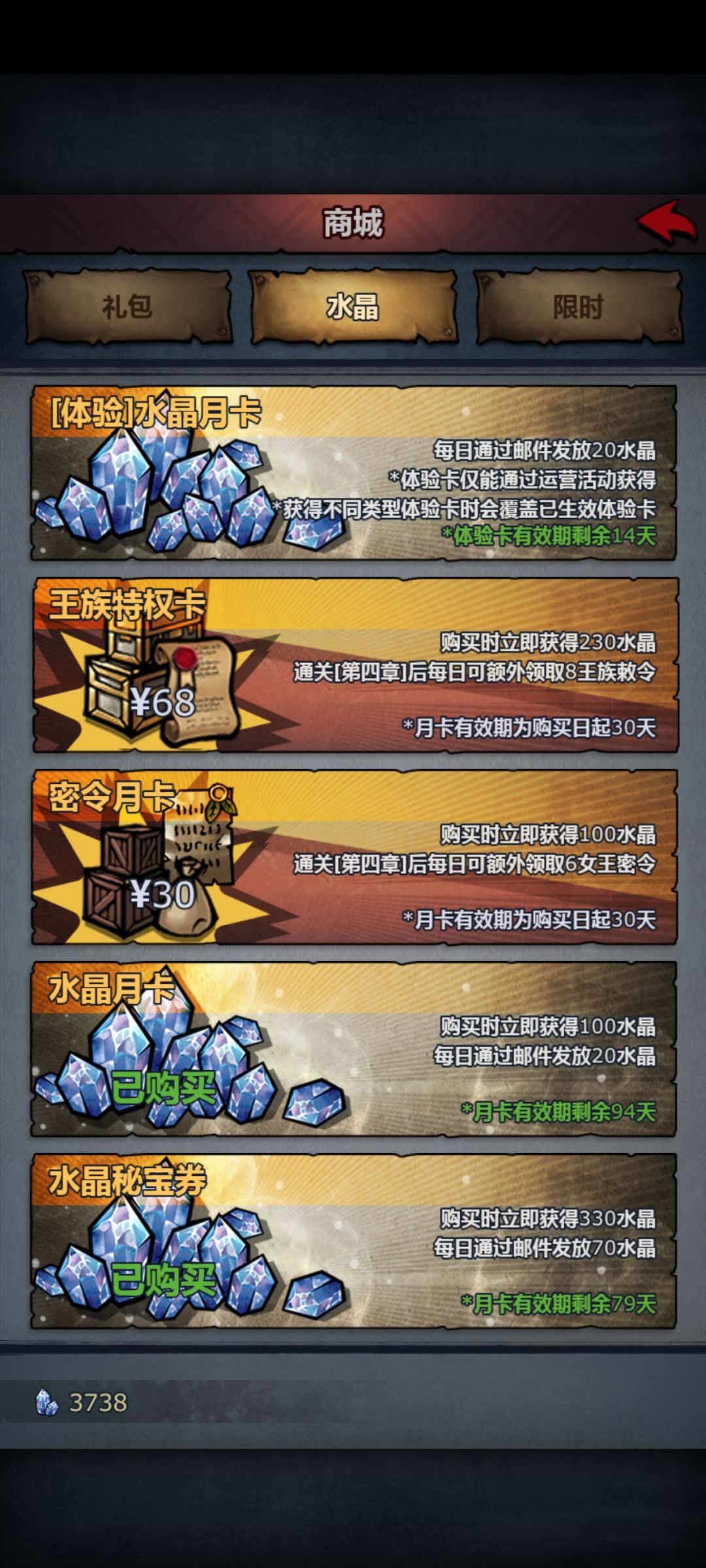 水晶3738,龙魂280,水晶龙魂自选箱274,结晶剩3个,辉月剩1个,星海剩4个,5个星海辉月自选箱,神魂石400个,大月卡79天,小月卡94天