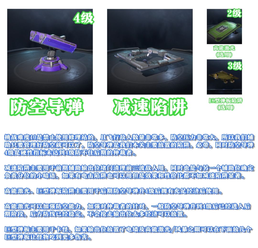 防空导弹(必选)、减速陷阱、高能激光(选用)、巨型弹板陷阱(选用)